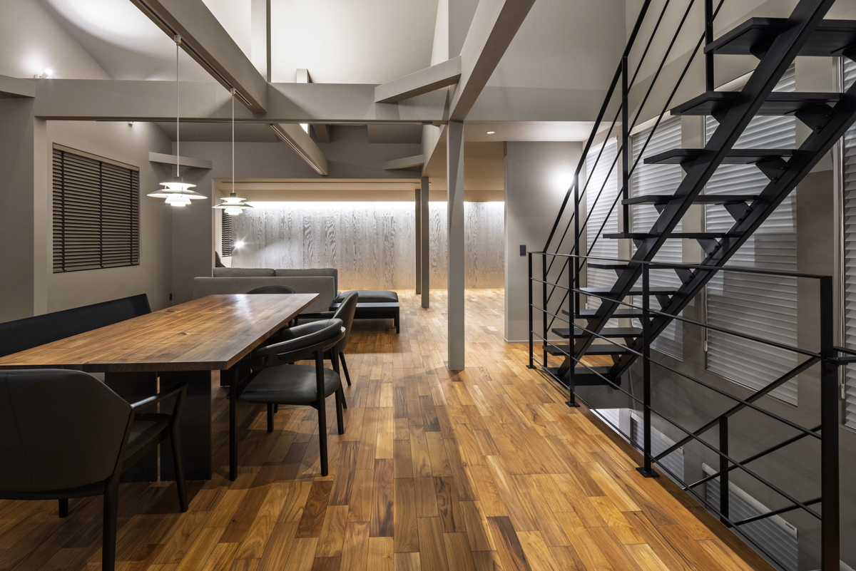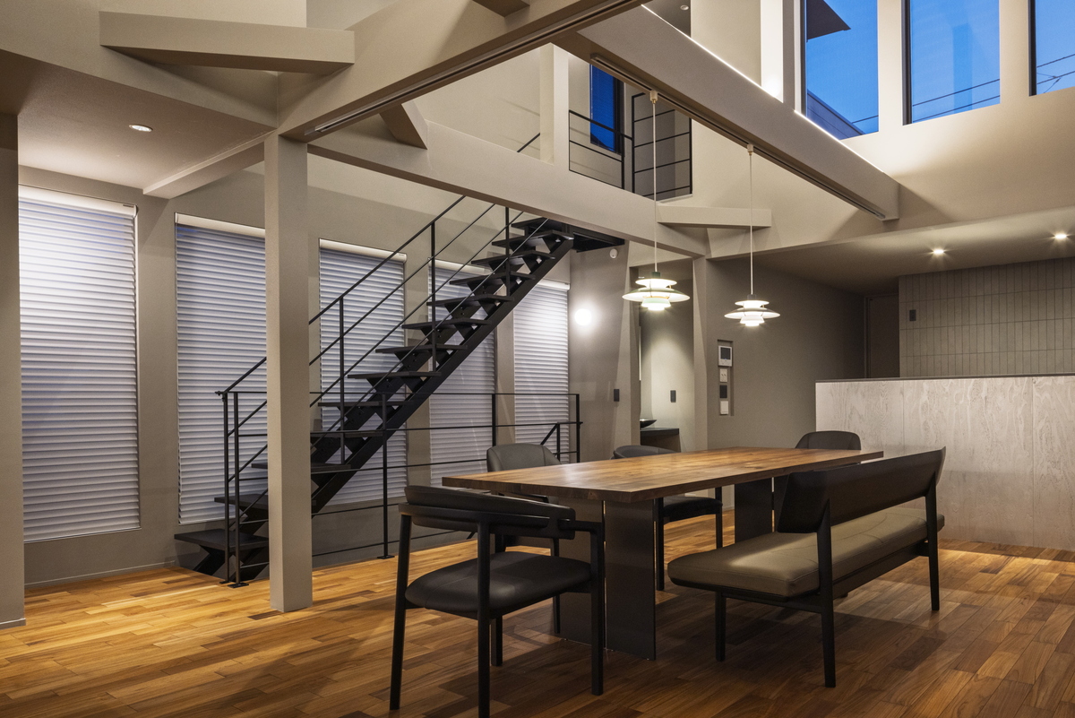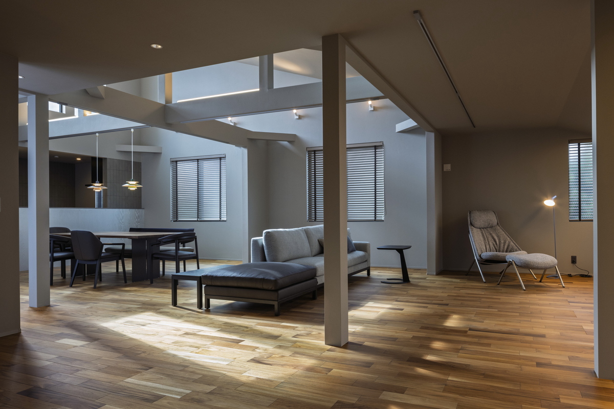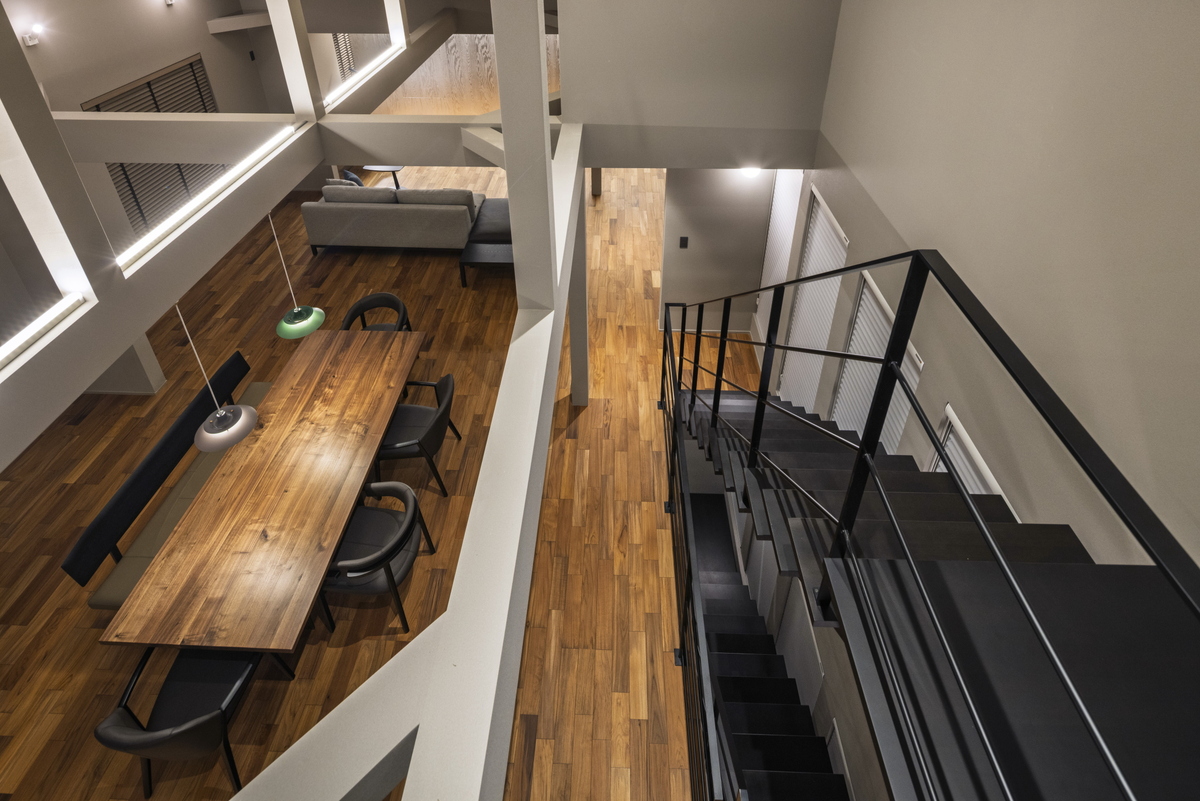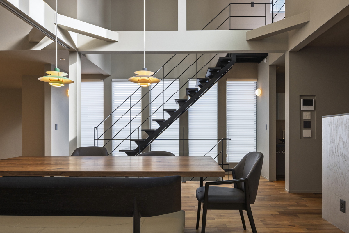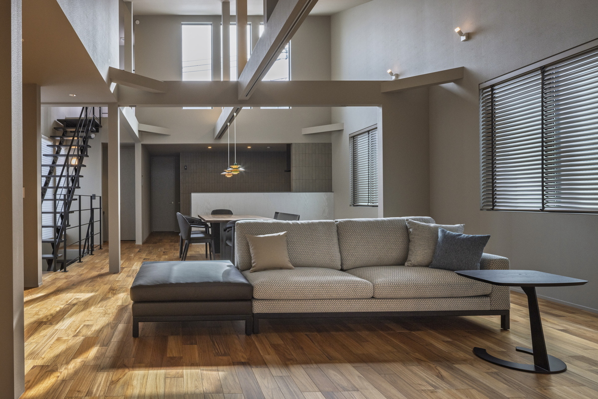 2Fリビング×勾配天井で、天井高を最大化し明るく開放的な空間に仕上げました。