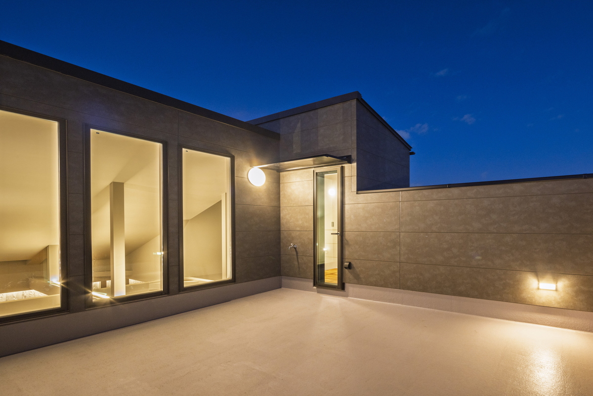 WORKS 代田戸建 建物正面の外壁は錆茶色の建築素材SOLIDO(ソリド)を使用し、経年変化も楽しめる外観に。2Fリビング×勾配天井で、天井高を最大化し明るく開放的な空間に仕上げました。細部の仕様や色合いにもこだわった建売住宅です。